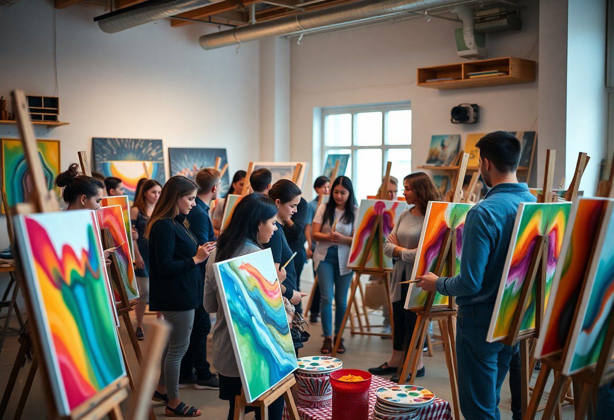 Your journey into the world of art begins at an acrylic painting workshop, where you’ll explore the fundamentals of this versatile medium. These workshops typically provide all the necessary materials, from paints to brushes, while skilled instructors guide you through various techniques. It’s an ideal environment for both beginners and experienced artists to enhance their skills, experiment with creativity, and gain confidence while creating unique pieces of art.